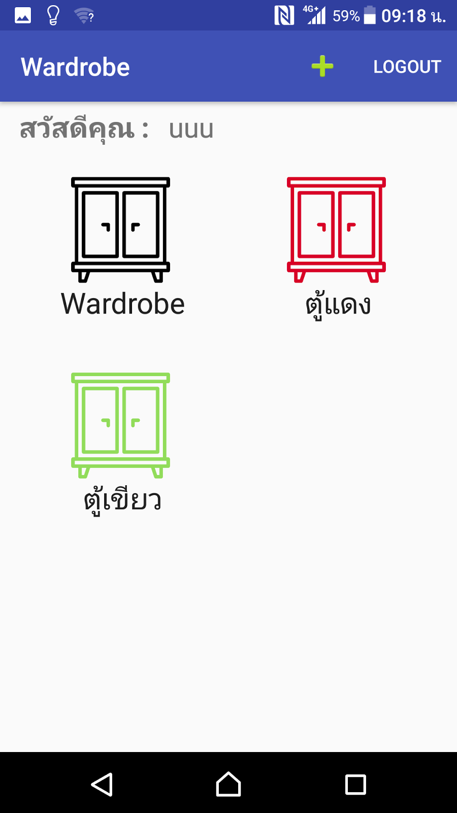 หน้าเพิ่มตู้ (Adding Wardrobe) สามารถเพิ่มตู้ได้โดยเลือกสีของตู้ และตั้งชื่อตู้ได้ครับ จากนั้นกด "สร้างตู้" แล้วก็จะไปหน้า MainActivity ตู้ที่เราสร้างก็จะแสดงออกมา