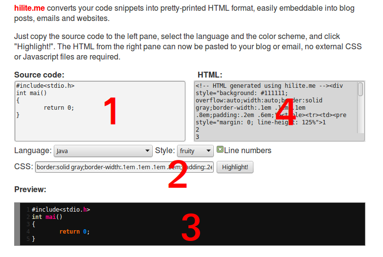 และนี่คือหน้าตาของเจ้า hilite.me นั้นเอง ซึ่งวิธีการวางโค้ด (Source Code) นั้นก็ง่ายมากๆ ทำเรียงตามตัวเลขไปเลยครับ